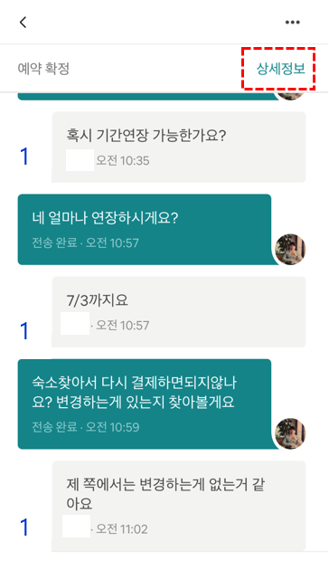게스트와 채팅창, 메시지를 주고받는 곳에서 오른쪽 상단에 상세정보를 누르세요