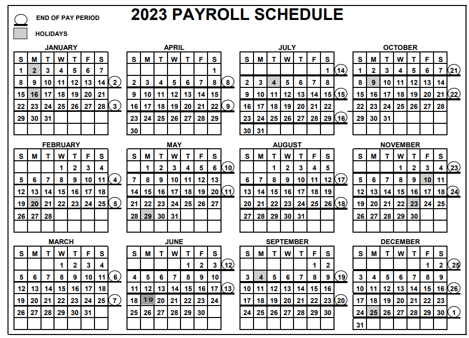 거의 모든 다른 해와 마찬가지로 2023년에는 26개의 격주 지급 기간이 있으며 12개월 중 2개월은 3회 지급됩니다.