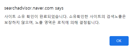 사이트를 등록하고나면 사이트 소유 확인 완료 문구를 확인할 수 있습니다.