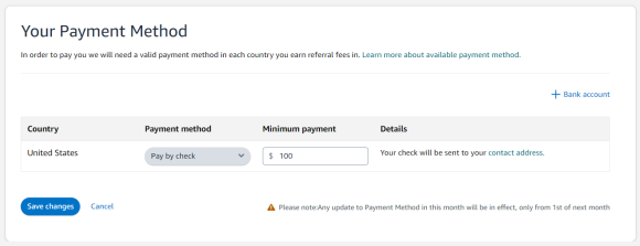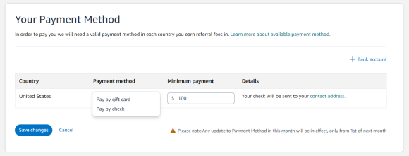 이런식으로 선택을 할 수 있고 체크로 선택을 할 경우는 최소금액을 설정하실 수 있습니다. 이렇게 설정하는건 구글애드센스랑 똑같은데, 아래와 같이 만약 100불로 설정을 해놓으시면 수익금이 100불이 채워지면 체크로 보내주는 형식입니다.