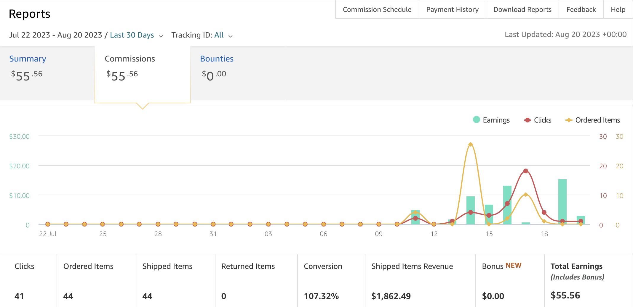 제품 구매 수량(Items Shipped), 구매 금액(Revenue), 커미션 금액(Commision Income)을 알 수 있습니다.