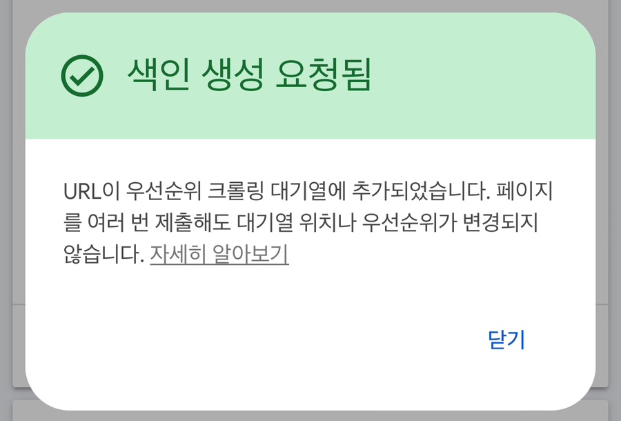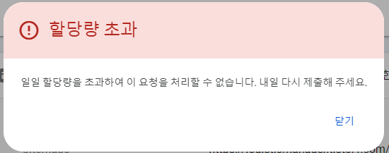 하루에 너무 많이 페이지색인을 요청하면 아래화면처럼 할당량 초과가 뜹니다.