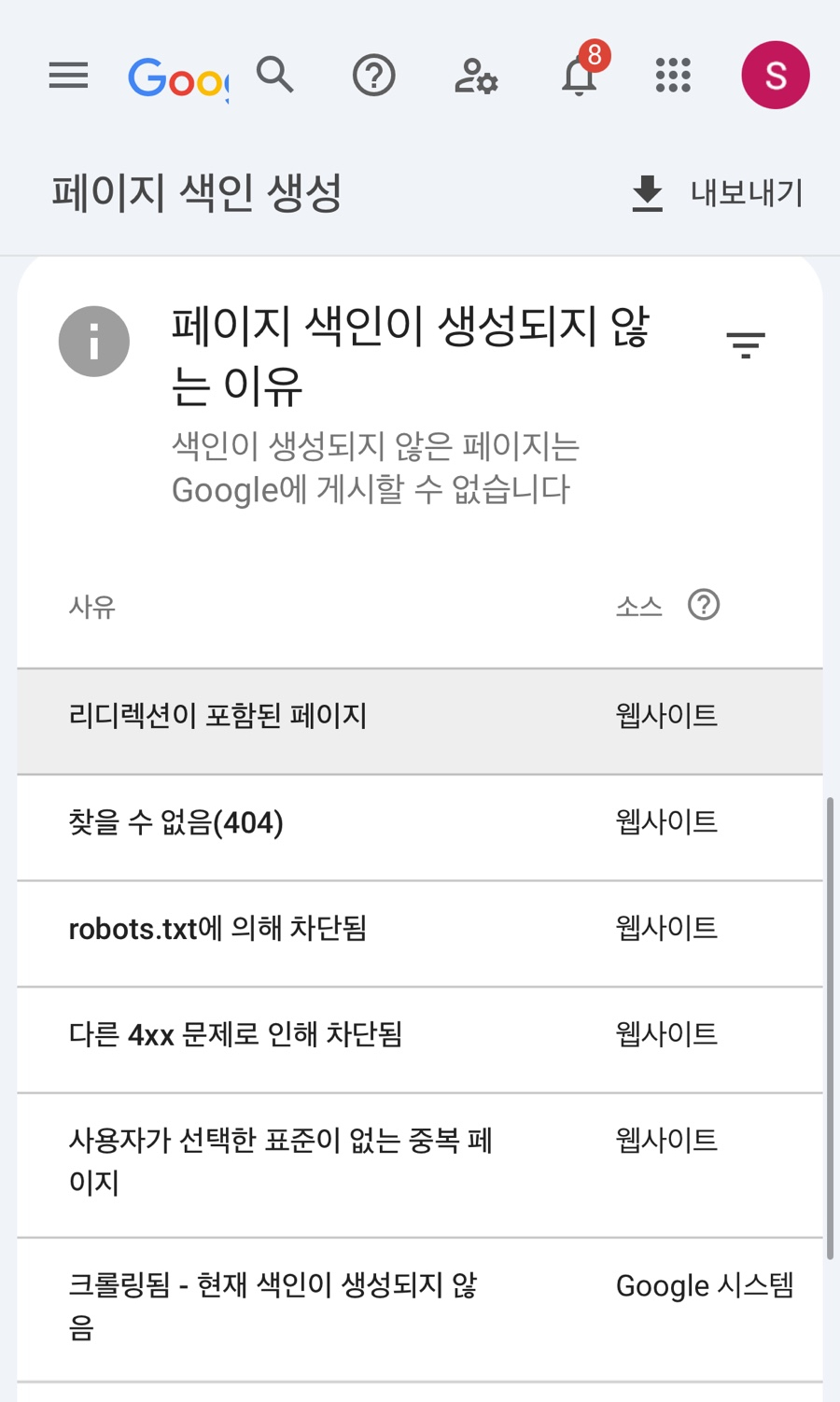 페이지 색인이 생성되지않는 이유와 그 아래에 리스트가 쭉 나옵니다.