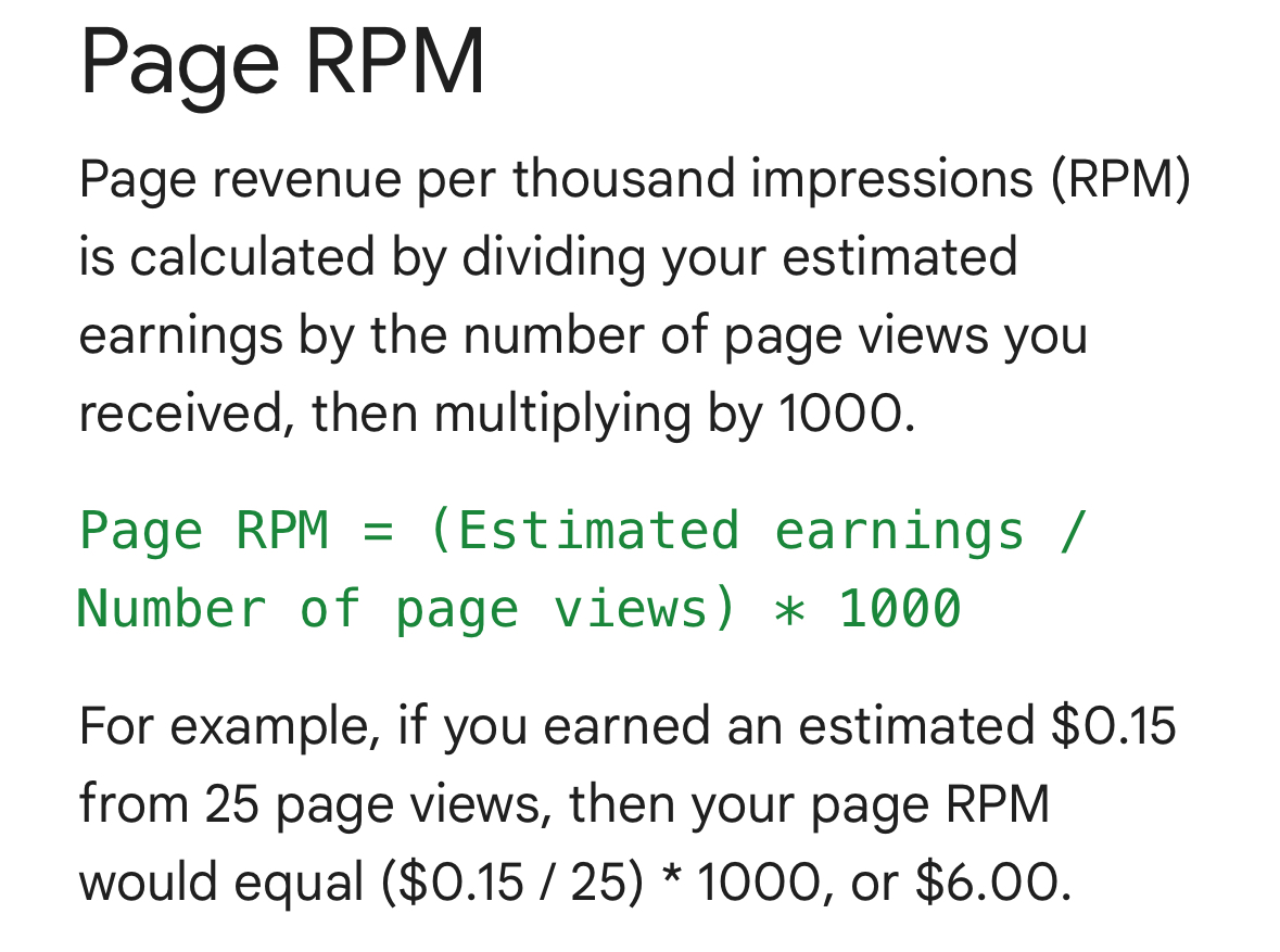 1000개 노출당 수익을 말함. 25회의 페이지 조회수에 따른 예상 수입이 0.15달러라면, 페이지 RPM은 6달러가 됩니다((0.15 / 25) * 1,000).
