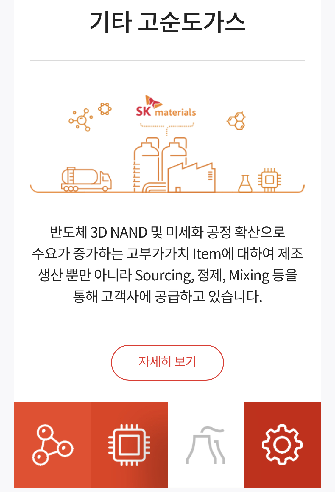 SK머티리얼즈는 SK그룹이 2015년말 OCI로부터 인수한 반도체용 특수가스 공급업체인데 최근 일본의 수출규제에 대응해 ‘소부장’ 대표 기업으로 부각되고 있다.
