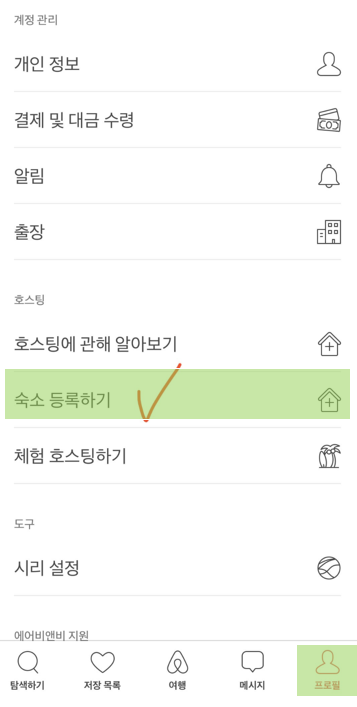 이렇게 프로필 > 숙소 등록하기 눌러주세요