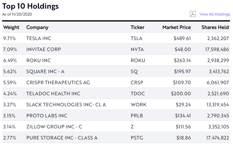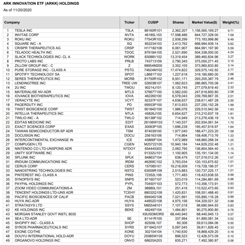 11월 20일 기준으로 ARKK의 비중은 위 사진과 같습니다