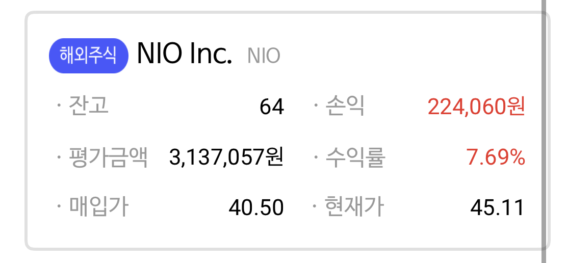 중국 자동차 회사 니오(Nio) 주가가 5.45% 상승한 후 시간이 지나면서 하락세로 돌아서 롤러코스터를 타고 있다. 니오 주가는 3일(현지시간) 하락세를 보이며 4.55% 내린 45.78달러를 보이고 있다. 수