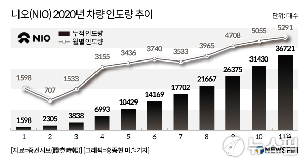 배런스에 따르면 니오는 11월에 전년 대비 109% 증가한 5천291대를 인도했으며 월별 판매량 기준으로 역대 최고를 기록했다.