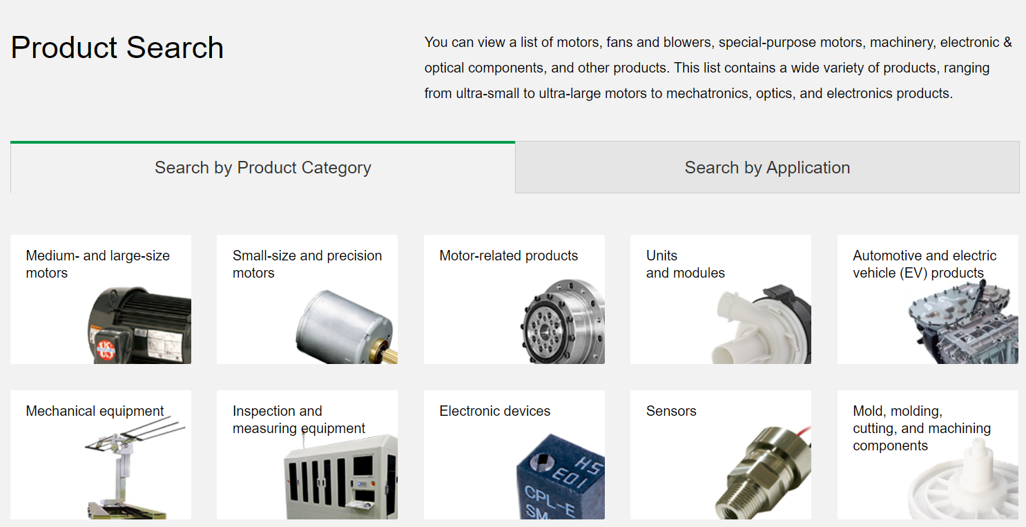 다양한 사이즈의 모터, 모터 관련 제품(감속기 등등), 유닛 모듈, 차량 제품, 로봇, 검사기, 전자장비, 센서, 각종 사출 가공품 등등