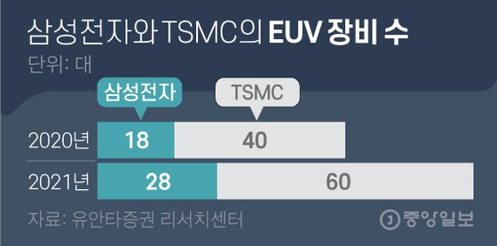 삼성전자 는 반도체 초미세 공정에 필수적 극자외선(EUV) 노광장비 확보에도 공을 들이고 있다. 올해 말 기준 TSMC와 삼성전자 가 보유한 EUV 장비는 각각 40대, 18대로 추산된다. 문제는 노광장비는 원천 기술을 확보한 ASML이 사실상 독점 공급하면서 대당 1500억원 이상인 가격에도 매년 확보할 수 있는 수량이 제한적이라는 점이다. 이재용 삼성전자 부회장이 지난 10월 직접 네덜란드 ASML을 방문해 장비 확보에 직접 나서면서 내년 삼성전자 가 10대가량을 추가로 확보할 수 있을 것이라는 전망이 나온다.