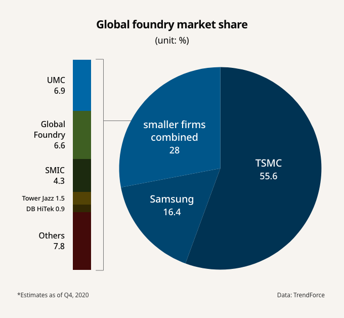 시장은 TSMC와 삼성전자 의 양강 체제다. 트렌드포스는 올해 4분기 세계 파운드리시장 점유율은 TSMC가 55.6%, 삼성전자 가 16.4%를 차지할 것으로 예상했다. 양사의 점유율 격차는 2분기 32.7%포인트까지 좁혀졌었다.