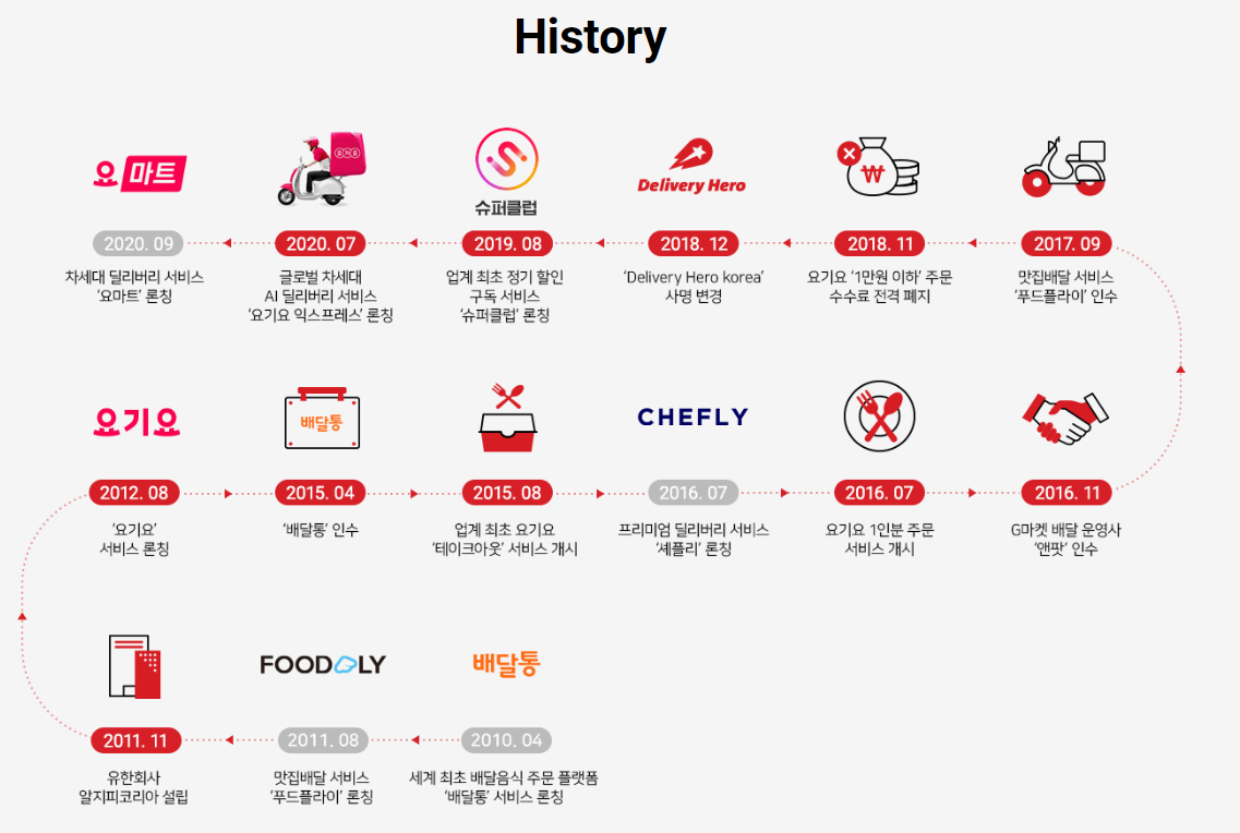 2019년 12월, 배달의민족을 운영하는 우아한형제들은 국내서 요기요와 ‘배달통’을 운영 중인 독일의 DH와 인수합병한다는 소식을 밝혔다. DH와 50:50 지분으로 싱가포르에 우아DH아시아 조인트벤처를 설립하고, 본격 아시아 시장 진출에 나선다는 포부도 함께 드러냈다.