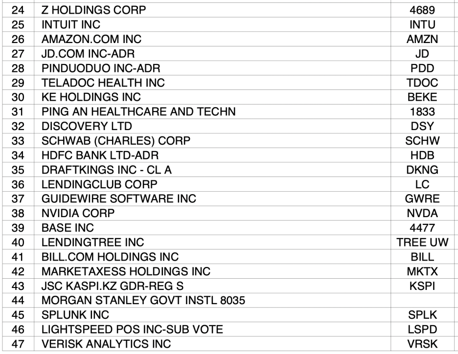 돈이 가장 많이 소비되는 종목(아마존, 애플, 텐센트 등등)도 포함되어있습니다