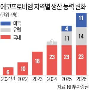 에코프로는 에코프로비엠의 전지재료사업과 에코프로에이치엔의 환경사업 양대 축을 중심으로 성장한다는 계획이다. 부분별로는 에코프로비엠 매출이 지난해 1조5000억원에서 2026년 17조원으로 늘어나고, 양극재 생산능력은 지난해 7만7000톤(t)에서 올해 12만5000t, 2026년 55만t으로 확대된다. 2026년 생산능력은 국내 23만t, 미국 18만t, 유럽 14만t 등이다. 환경사업은 매출이 지난해 1207억원에 불과했지만, 2026년엔 7500억원까지 늘리겠다는 계획이다.